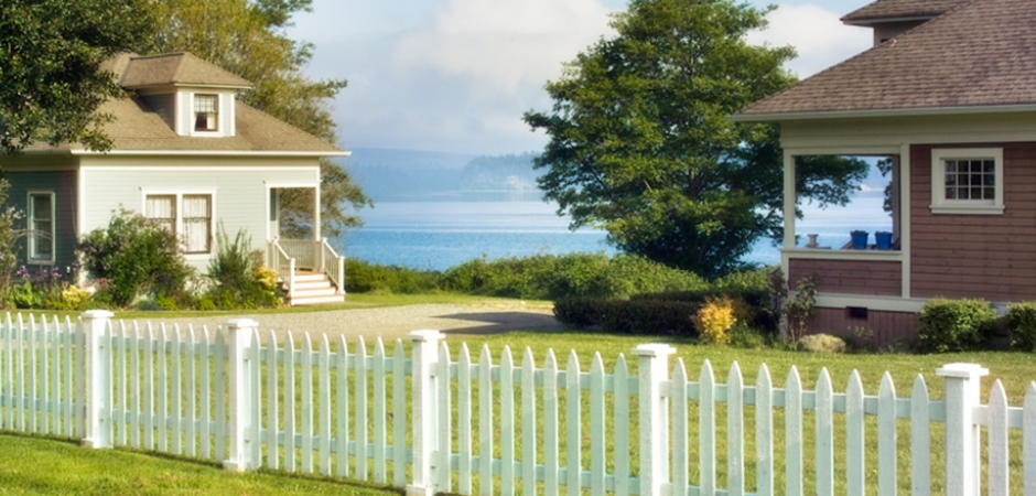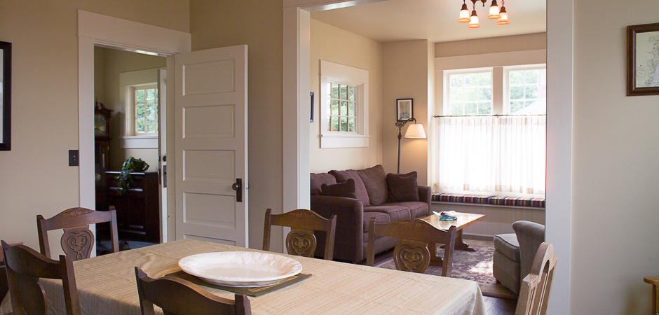 This idyllic and beautifully decorated vacation rental cottage (the brown house) features a three bedrooms, two baths, and can sleep up to eight people. It includes a fully equipped kitchen, dining room, fireplace and living room. All common areas provide beautiful views of the water.